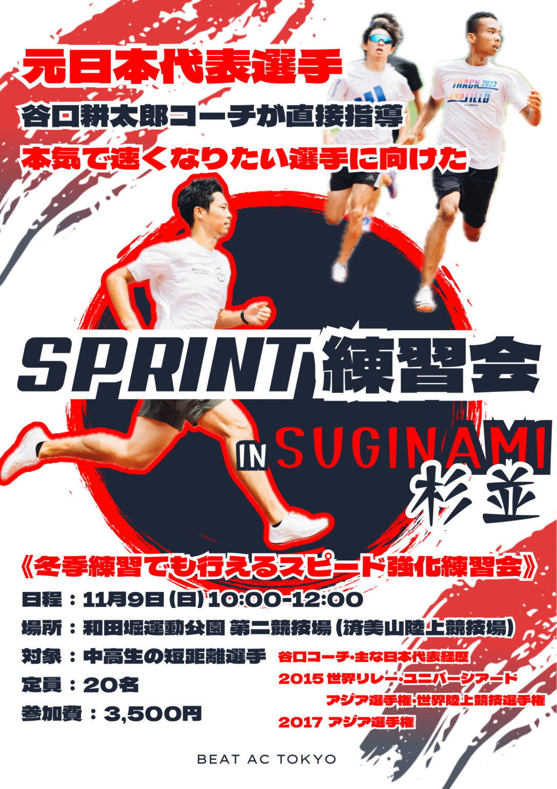 2025年11月9日(日)和田堀公園第二陸上競技場にて、BEAT AC TOKYO短距離ブロックヘッドコーチ、元日本代表選手・谷口耕太郎(現陸上競技コーチ)による2時間の「SPRINT練習会」を開催いたします。